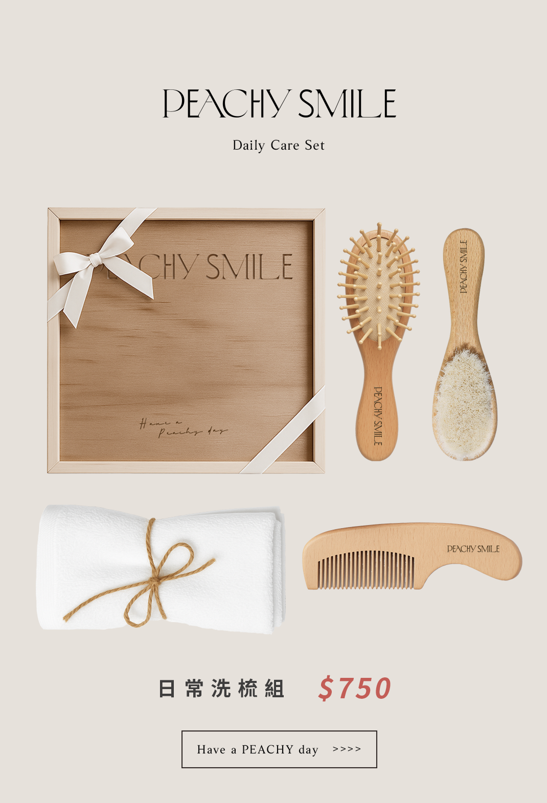 選用親膚純棉與溫潤木梳,搭配舒適泡沐刷與放鬆氣墊梳,