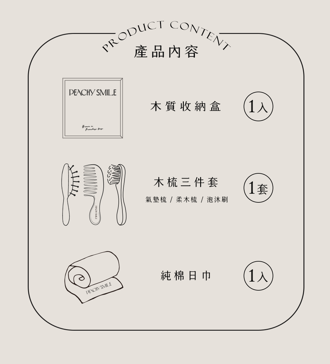 -組合內容 : 純棉日巾 + 柔木梳 + 泡沐刷 + 氣墊梳