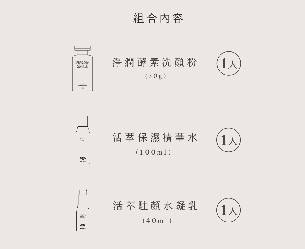 組合內容 : 淨潤酵素洗顏粉 30g X 1 + 活萃保濕精華水 100ml X 1 + 活萃駐顏水凝乳 40ml X 1
