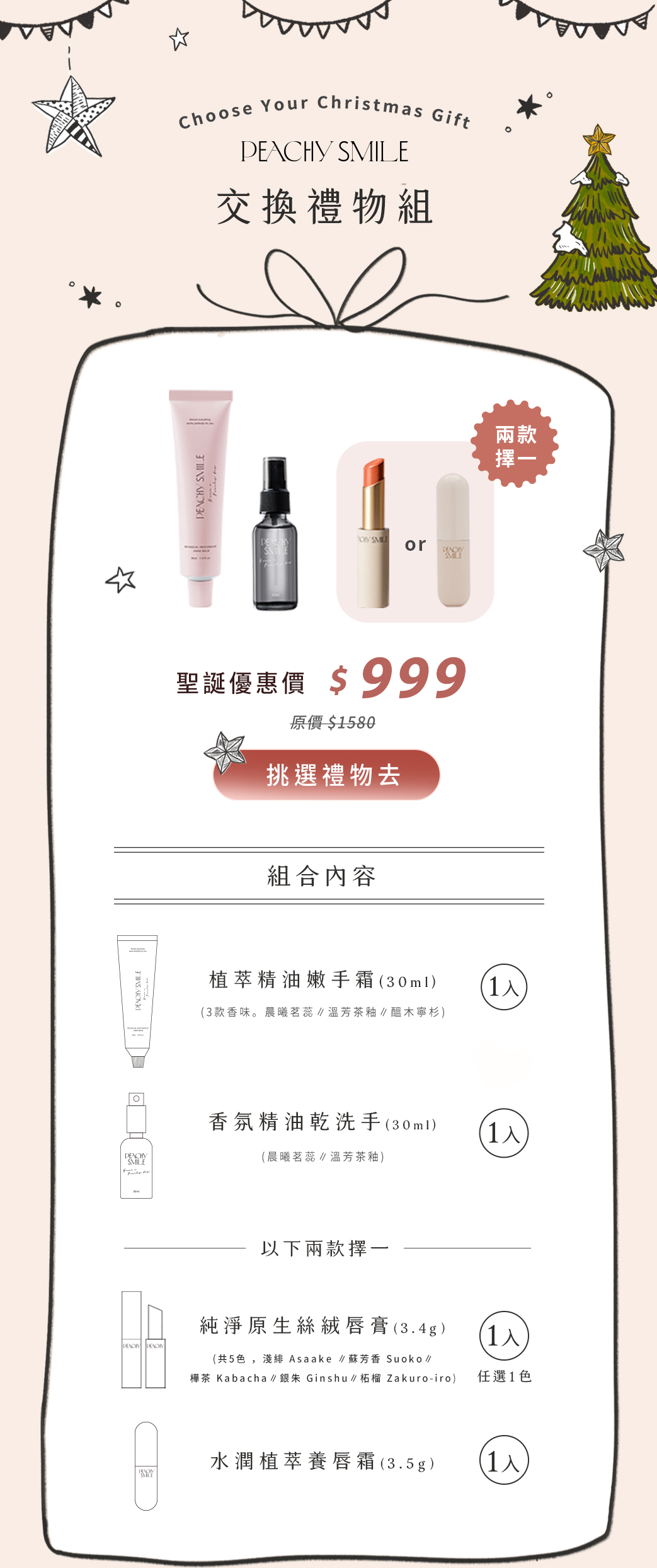 植萃精油嫩手霜 30ml*1(香味擇一) / 香氛精油乾洗手30ml*1(香味擇一) / 純淨原生絲絨唇膏 3.4g或水潤植萃養唇霜 3.5g*1 ,兩者擇一款
