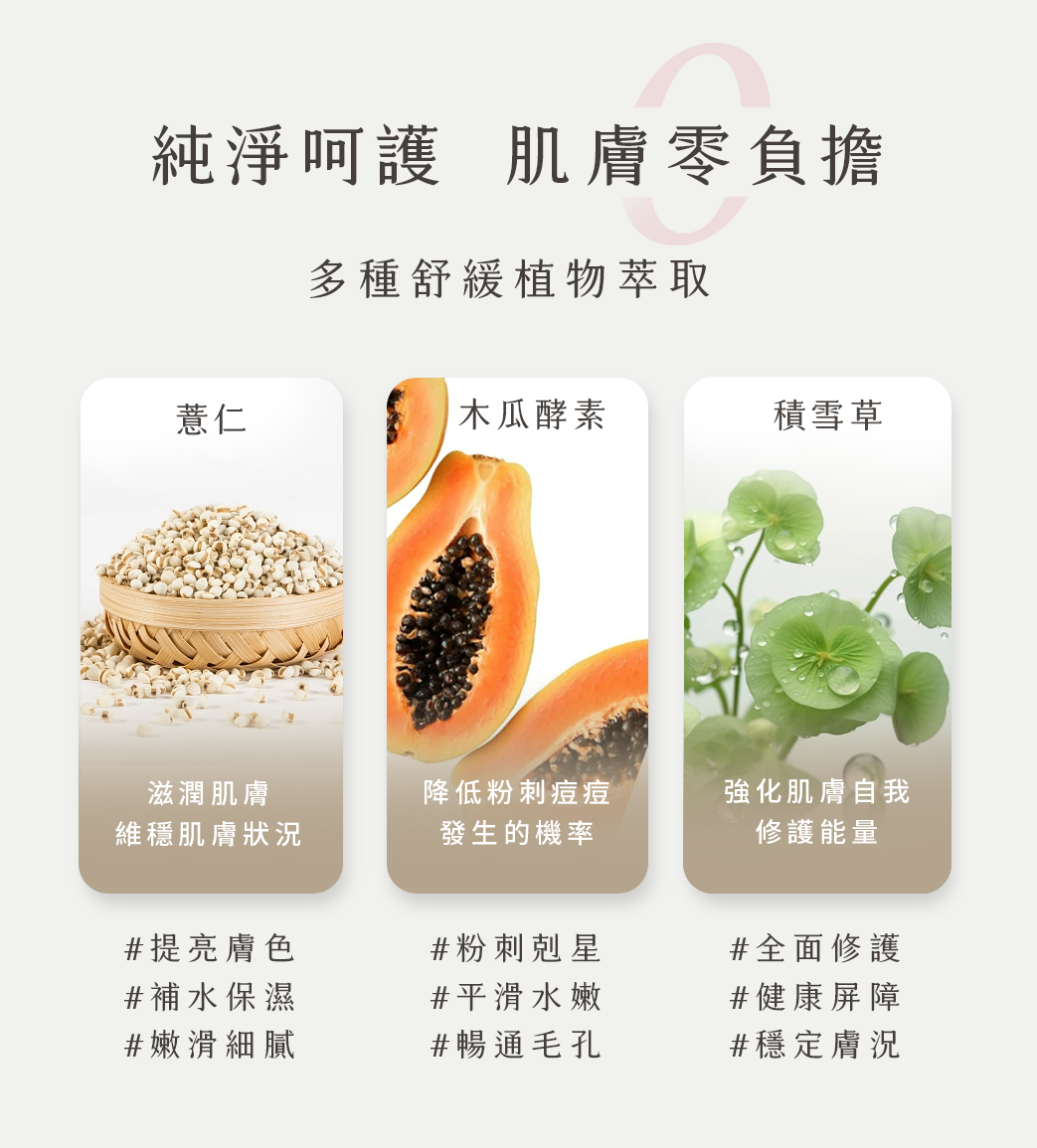 ■ 使用日本溫和胺基酸,高濃度積雪草與木瓜酵素